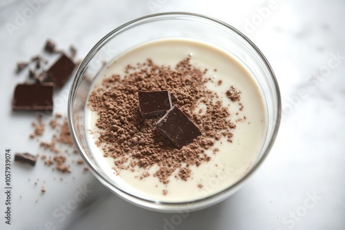 Delicious milk and chocolate bowl on kitchen table for breakfast