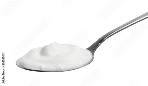 Delicious natural yogurt in spoon isolated on white