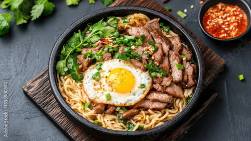 Delicious noodle soup with tender meat, soft egg, and fresh herbs in clay pot