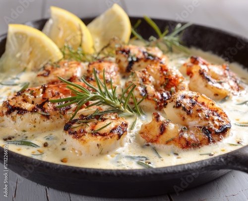 Delicious Pan-Seared Scallops with Lemon and Rosemary Cream Sauce.