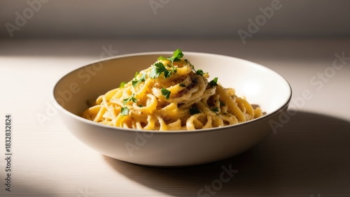 Delicious pasta dish in a white bowl, culinary delight, appetizing meal.