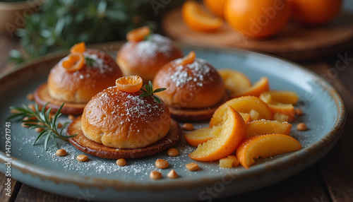Delicious pastry with orange slices and decoration on a rustic wooden table