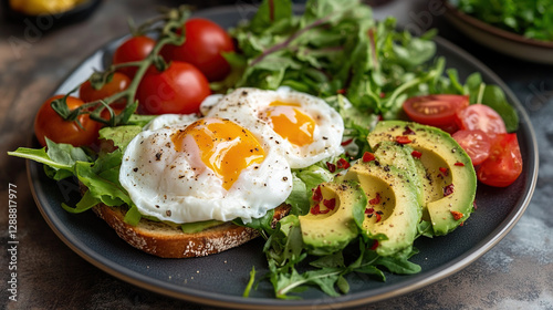 Delicious Poached Eggs with Avocado, Tomatoes, and Greens on Toast