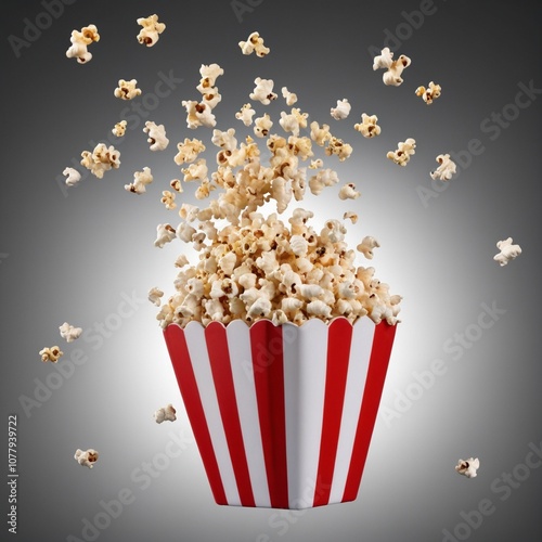 Delicious popcorn flying out of a red-white striped paper bag