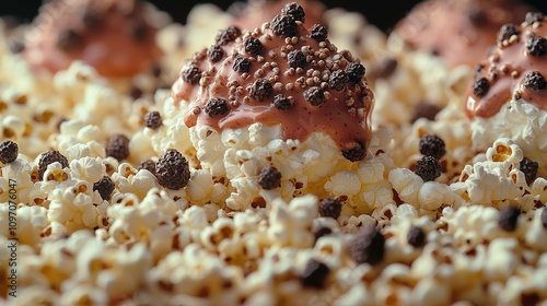 Delicious popcorn topped with chocolate drizzle and cocoa crunch