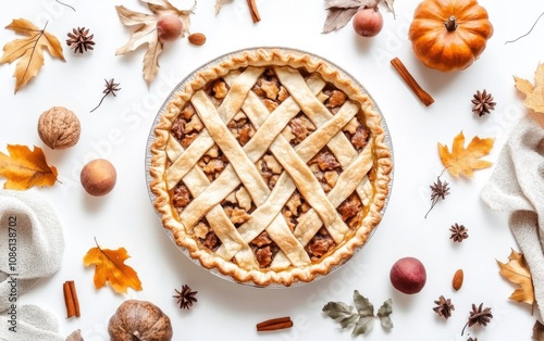 Delicious pumpkin pie surrounded by autumn decorations and ingredients for a festive gathering