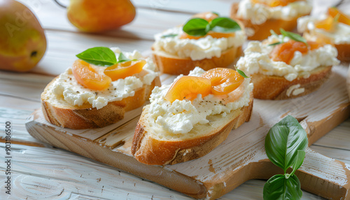 Delicious ricotta bruschettas with pears and apricots on white wooden table, closeup