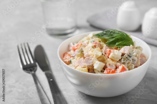Delicious salad Olivier on light table, closeup