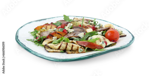 Delicious salad with beef tongue, grilled vegetables, peach and blue cheese isolated on white