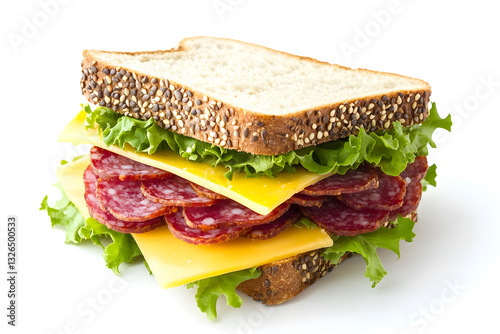Delicious salami sandwich with cheese, fresh green lettuce, isolated on white backdrop