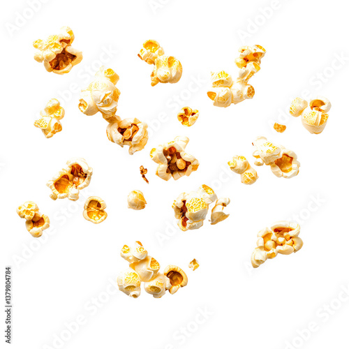 Delicious scattered popcorn kernels on a transparent background, perfect for movie night, snack time, or food illustration concepts