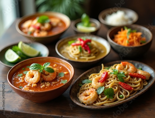 Delicious seafood dishes arranged on wooden table with vibrant colors and fresh ingredients