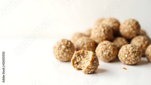 Delicious sesame energy balls stacked with a bite taken out