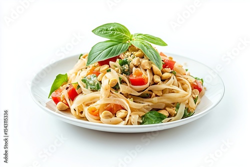 Delicious Shan flat noodle salad with fresh herbs and peanuts topping showcased on a white background