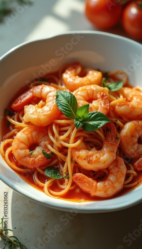 Delicious shrimp scampi pasta in tomato sauce with basil in bowl