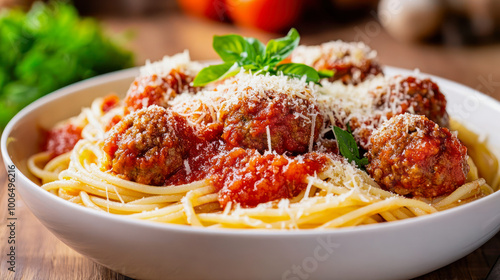 Delicious spaghetti and meatballs served on a white plate, topped with fresh basil and grated cheese, set on a wooden table