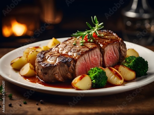 Delicious steak with potatoes vegetables and steak sauce on a plate. Generative AI.