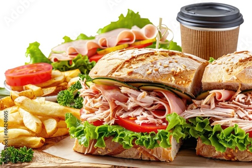 Delicious turkey sandwiches with fresh lettuce and tomatoes, served with crispy fries and coffee. Perfect meal for lunch or a picnic.