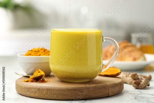 Delicious turmeric latte, powder and rhizomes on white marble table, closeup