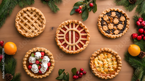 Delicious variety of homemade pies arranged beautifully with festive decorations on a wooden table