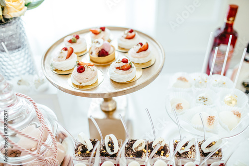 Delicious wedding reception candy bar dessert table full with cakes and sweets and a flower vase with hydrangeas on the background of an exquisite restaurant.