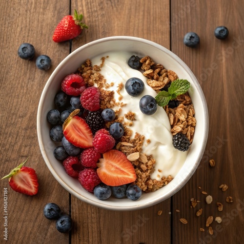 Delicious yogurt bowl topped with fresh berries and granola on a rustic wooden surface.