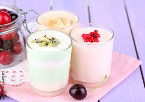 Delicious yogurt with fruits tastes in glasses and fresh fruits