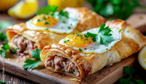 Deliciously baked golden pastries filled with savory minced meat and topped with a fried egg and fresh herbs, perfect for breakfast or a light meal
