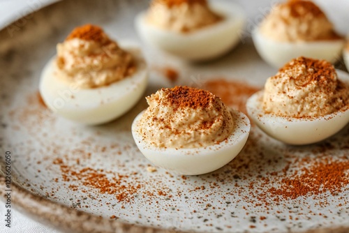 Deliciously prepared deviled eggs garnished with spices on a rustic plate, perfect for gatherings