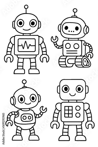 Delightful Collection of Four Friendly Robot Coloring Pages for Kids, Featuring Cute and Simple Outline Designs, Perfect for Toddlers, Preschoolers, and Young Children to Color and Enjoy Creative Fun