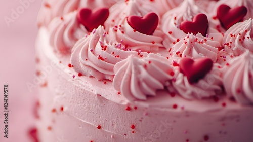 Delightful Pink Cake with Heart-Shaped Decorations and Sprinkles