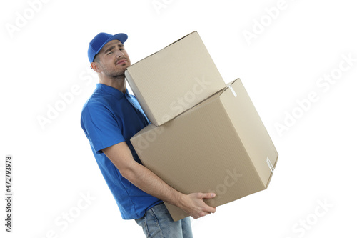 Delivery man holds boxes, isolated on white background