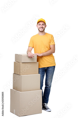 Delivery man with cardboard boxes on white background