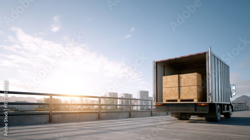 Delivery Truck on Urban Bridge at Sunset with Boxes Ready for Shipment