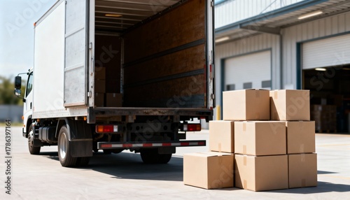 Delivery truck parked at a logistics center loading dock next to stacks of shipping boxes.