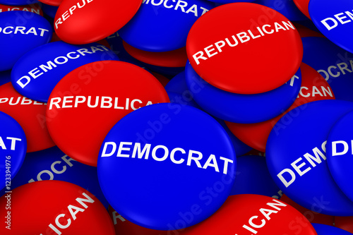 Democrat Party vs Republican Party Campaign Buttons Pile 3D Illustration