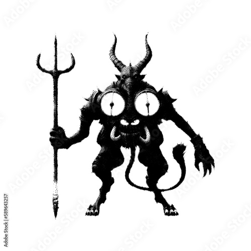 Demon with horns and tail holding a trident. Vector illustration. Pointillism design.