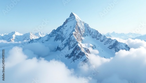 Dense fog swirls around snow-capped mountain peak, winter, summits, mountains