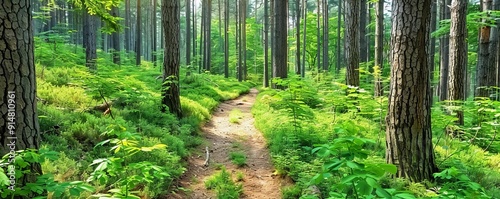 Dense forest trail illuminated by dappled sunlight, dense forest, nature's beauty