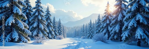 Dense frosty forest with towering conifers and sparkling snowflakes, cold weather, winter landscape, winter scenery