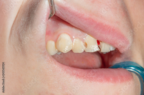 Dental caries. Filling with dental composite photopolymer material using rabbders. The concept of dental treatment in a dental clinic