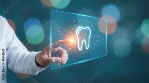Dentist touching glowing digital tooth icon on transparent virtual screen with bokeh lights