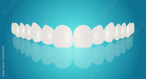 Denture, human teeth on blue background with reflection. Copy space.