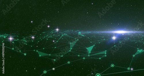 Depicting teal mesh spanning across space horizon, showing hex markers, lines, facets, stars, flare