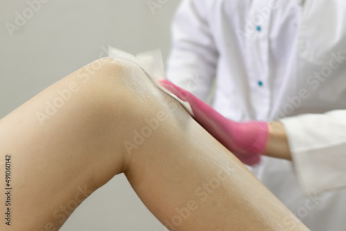 depilation of the girl's legs, the hands of the master in pink gloves treat the skin with disinfection