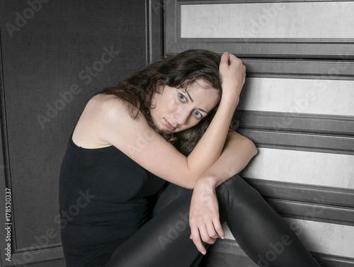 Depressed woman sitting on the floor in the corner on the black and white background.