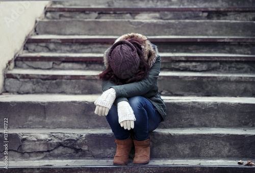 Depressed young woman sitting on stairs
