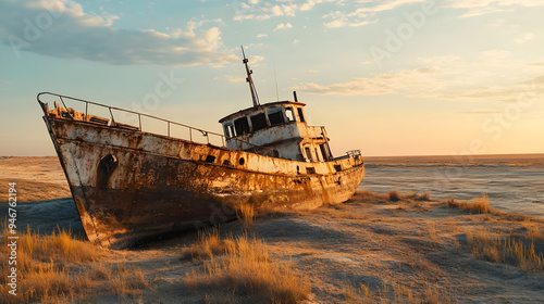 Derelict Ship in Dry Aral Sea Lane Amidst Desert Wasteland