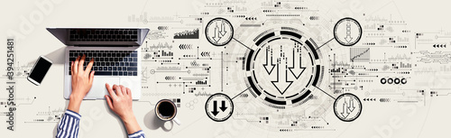 Descending arrows with person using a laptop computer