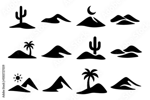 Desert and mountain silhouettes with moon, sun, cactus, and palm trees